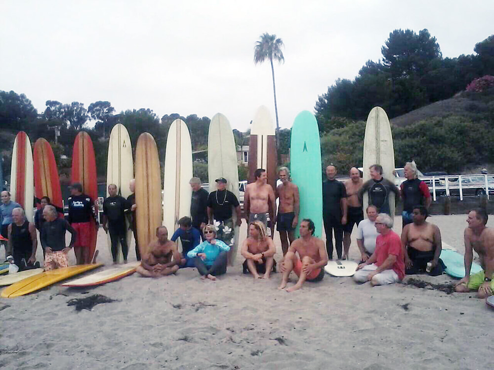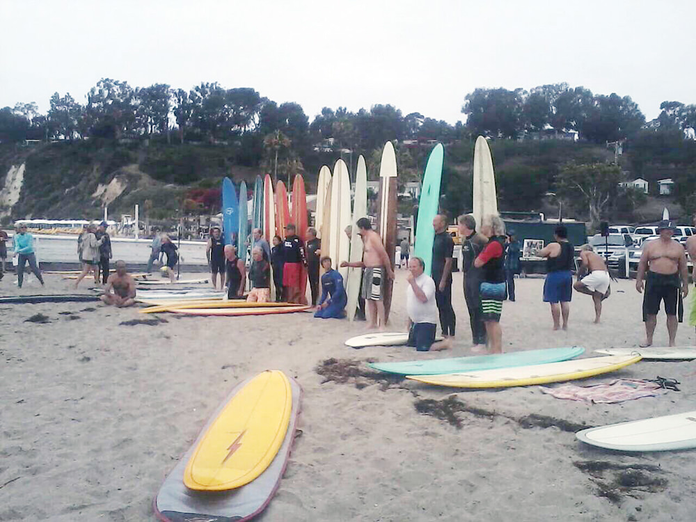パドルアウトの前にMy Dave Sweetを立てて記念撮影。そしてGregが先頭を切って海に入りパドルアウト。少ししてから一斉にみんなが後を追うようにパドルアウト。沖合で少しずつ輪になってゆく。完全に輪になったところで隣り同士手をつなぐ。
