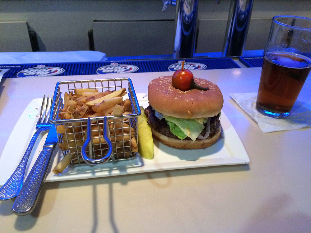 バーテンダーにこの食事券は使えるかどうか尋ねると、OKとのこと。ハンバーガーセットとドラフトビールをオーダーする。こんなカウンターで昼からビール飲むのはラスベガス以来かな(笑)