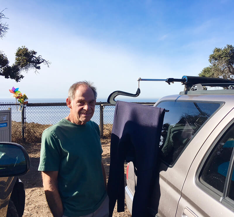 Pipe’sは背後が高い崖になっているので、比較的風の影響を受けにくい。Philのクルマがあるので、すでに海に入っているのだろう。いたいた。背中を丸める独特なスタイルで波を最後までメイクする。さあ、僕も着替えて崖を下ることにしよう。